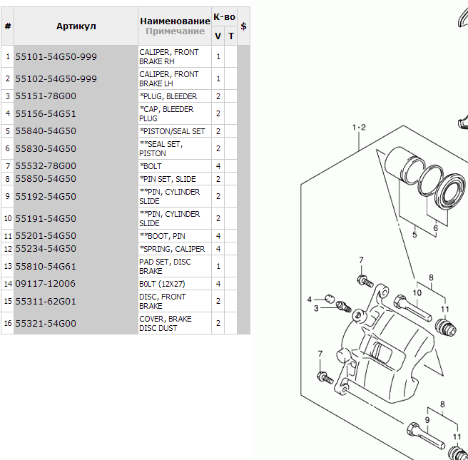 Если делаете в сервисе,то заказывайте сразу с поршнем,хотя бы одним !чем в итоге закончилось? тоже течь в районе переднего левого суппорта, хочу на сервис ехать сразу с ремкомплектом, что заказывать - "большой" 55840-54G50 - туда входит поршень и резинки, или "малый" 55840-54G50 - только резинки.