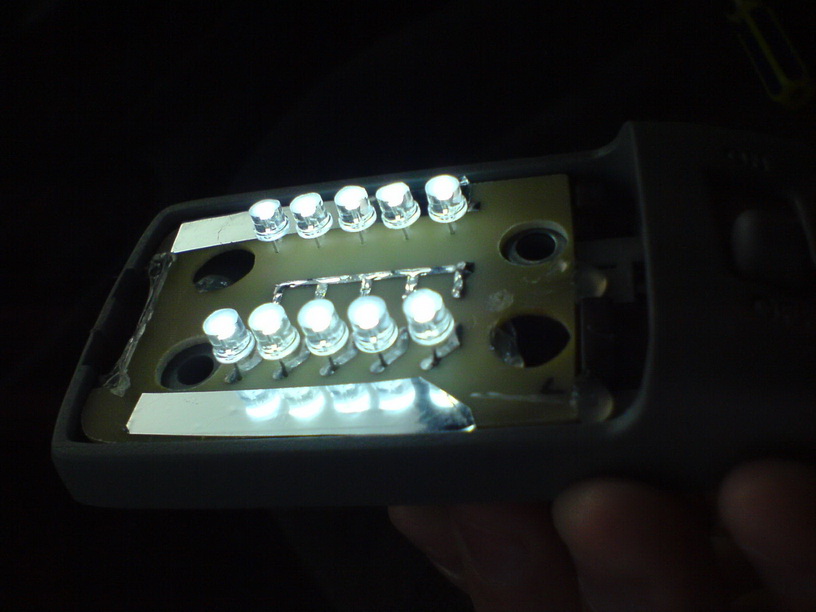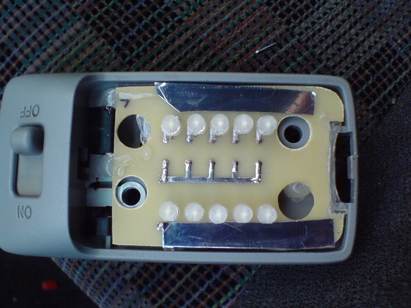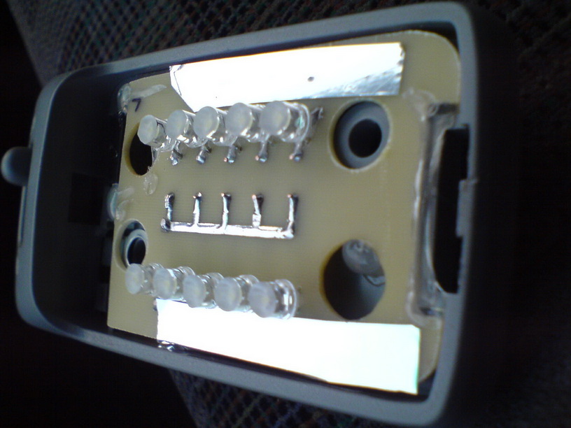 Я взял 5-6 кусков картона, склеил их между собой суперклеем, и обтянул это дело фольгой(чтоб лучше отражало свет) и вырезал по размеру плафона чтоб легко в него вставлялась пластина. В ней сделал 8 дырок в которые вставил светодиоды.