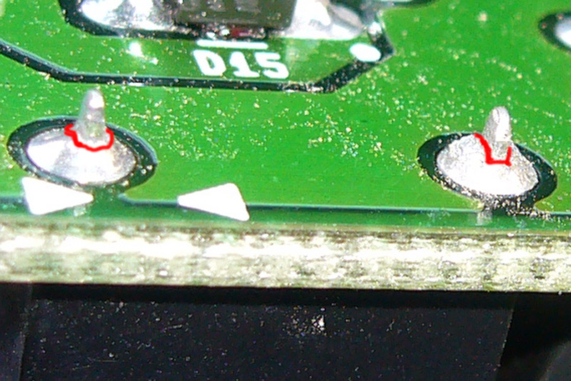 Отличное фото самого проблемного места, спасибо.Красным цветом на фото отмечены места где отошла пайка от ножек реле.