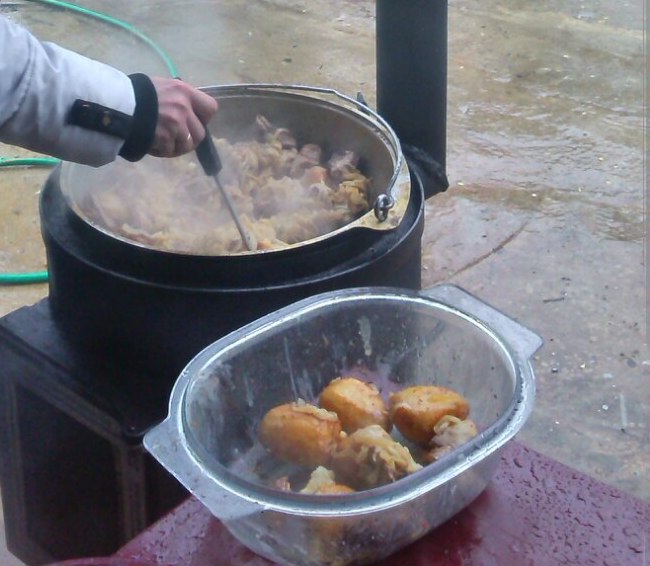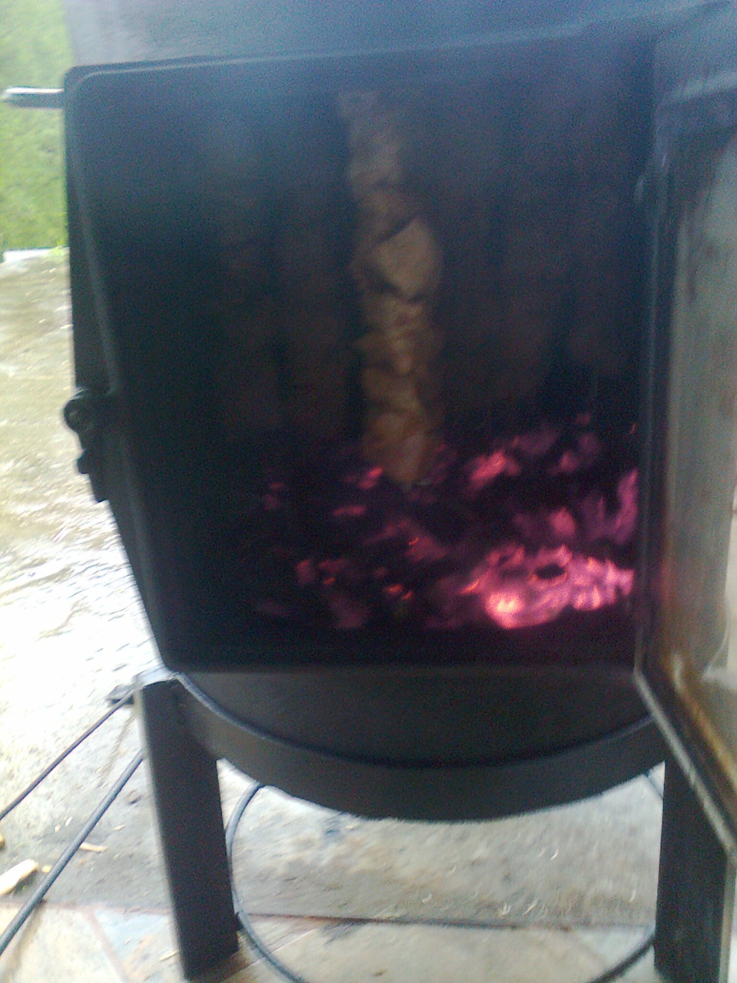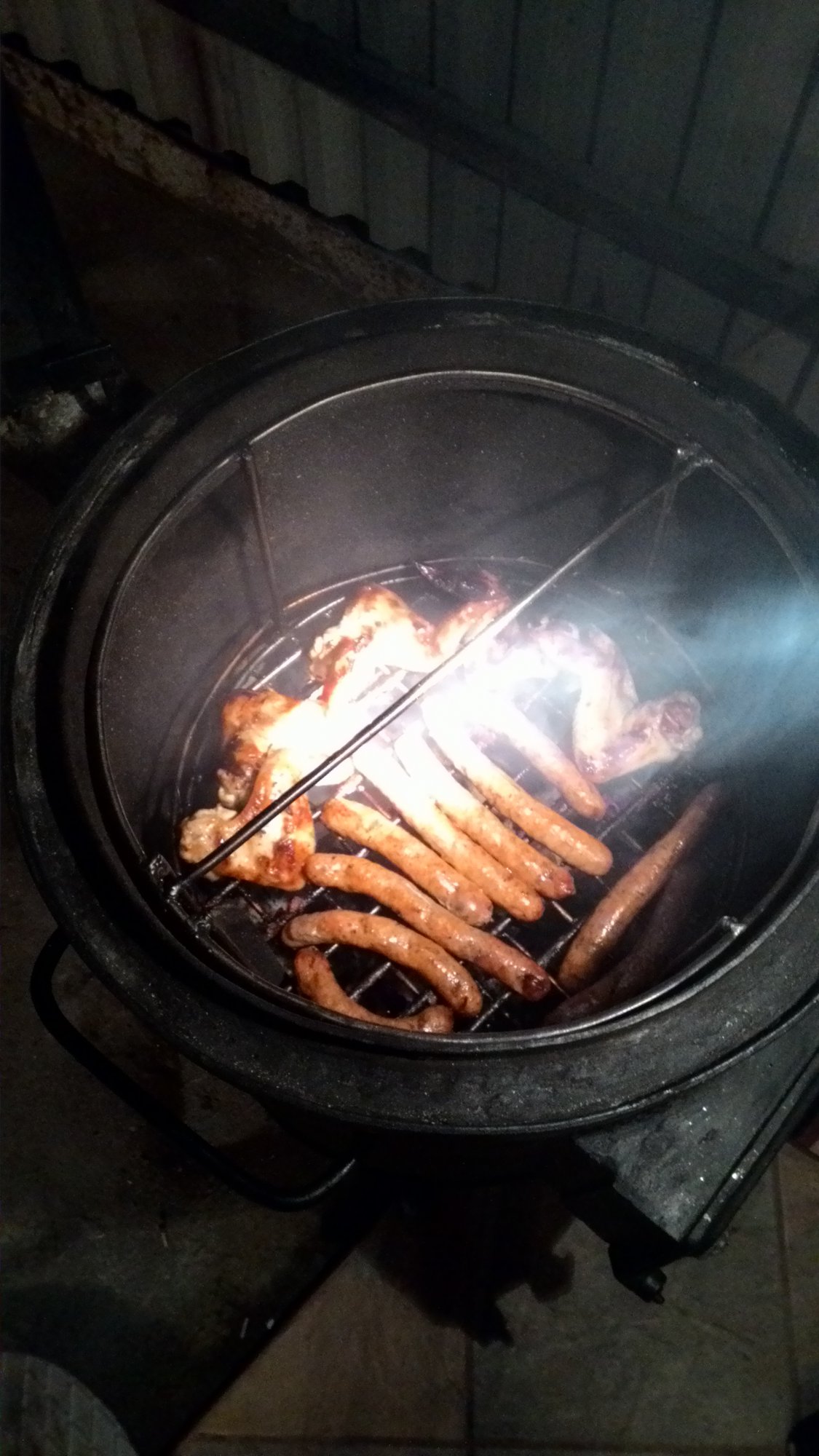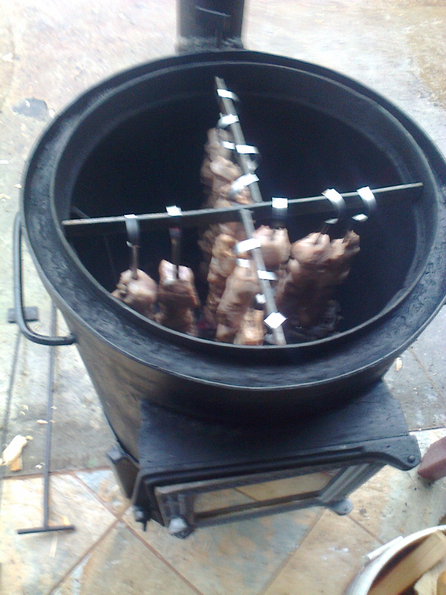 Шашлык - это доп опция - по образу тандыра ! Нижние кусочки снимаются раньше по мере готовности ! Доставать можно рукавичкой . ну а я пассатижами . по привычке . Печка делалась в основном для казана . ну а мясо лучше на решетке делать большими кусочками ! Вся прелесть в том. что тепло не улетает . как на мангале . не зависит от погоды и жар можно регулировать при помощи поворотной заслонки в трубе. Колосниковая решетка регулируется по высоте в процессе в зависимости от задачиЯ впервые вижу такой мангал! Шампура висят - они что, так и коптятся над углями? Интересный вариант? А самые нижние куски потом не подгорают? А как потом доставать горячие шампура?