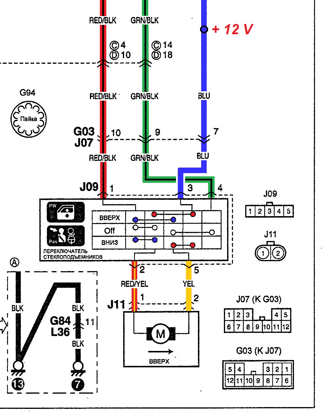 1. Тебе надо на пассажирской двери соединить на минус два провода - №1 (RED/BLK - красный с черной продольной полоской) и №4 (GRN/BLK - зелёный с черной продольной полоской) и проверить работает ли стеклоподъемник.