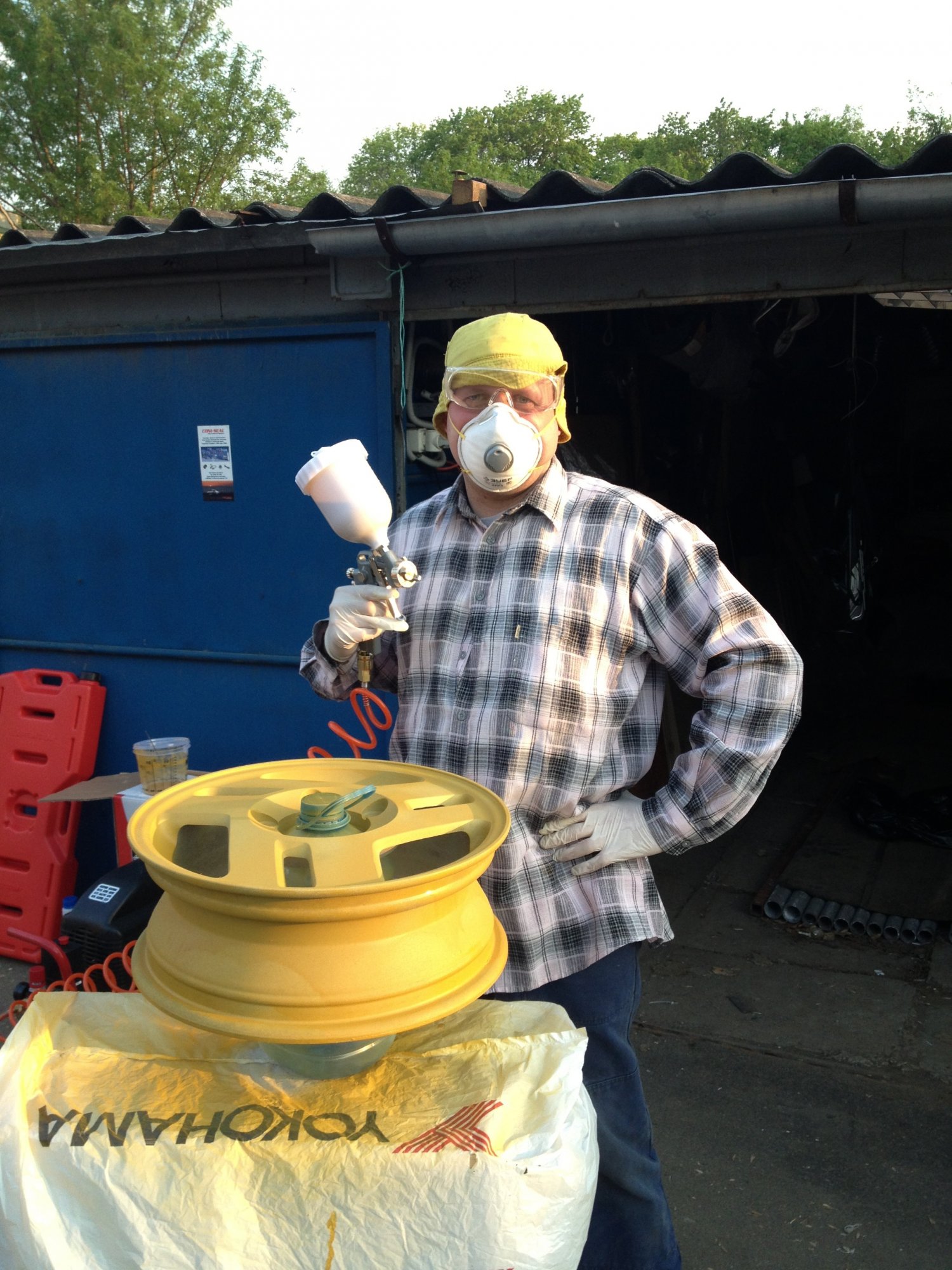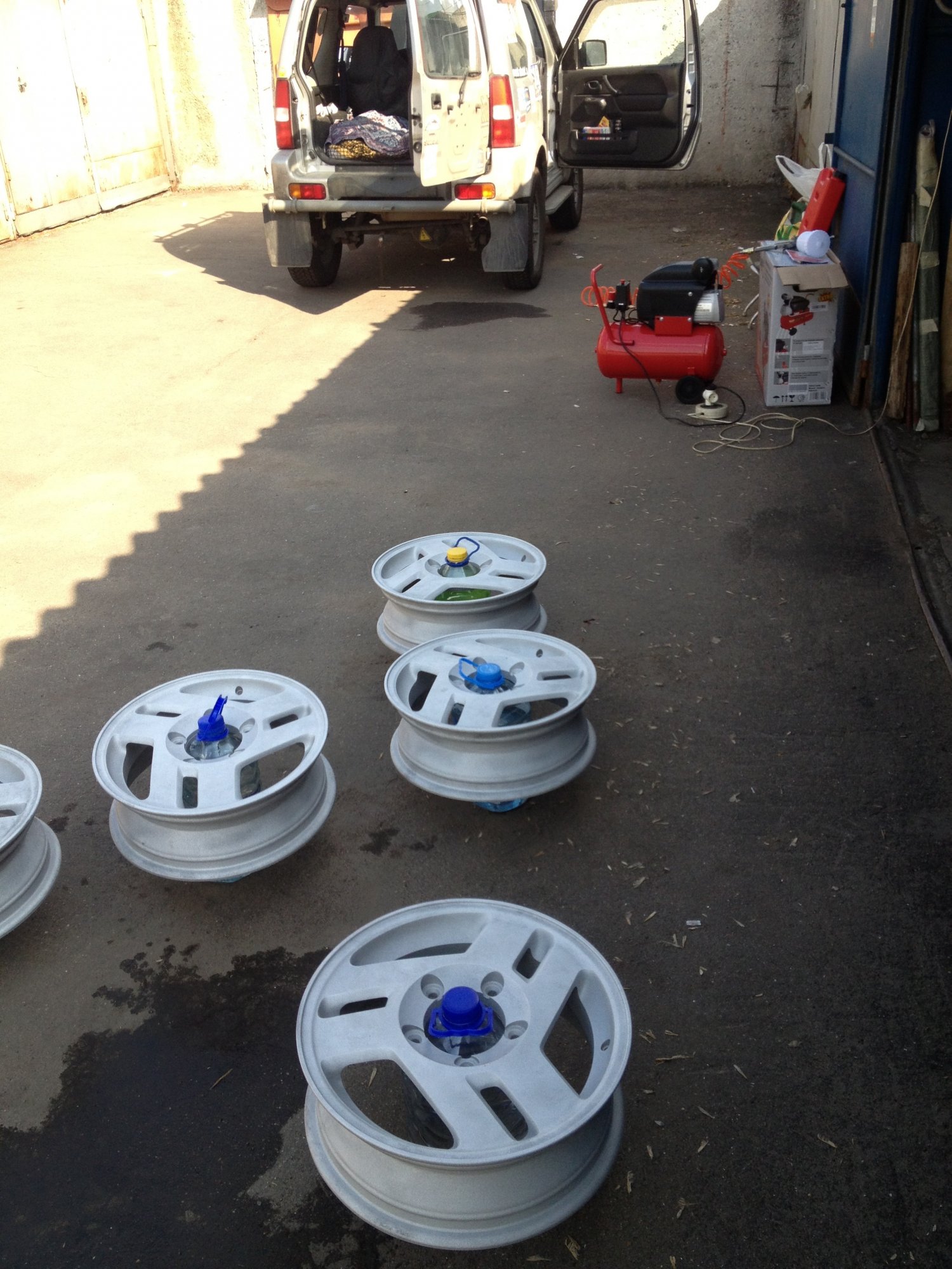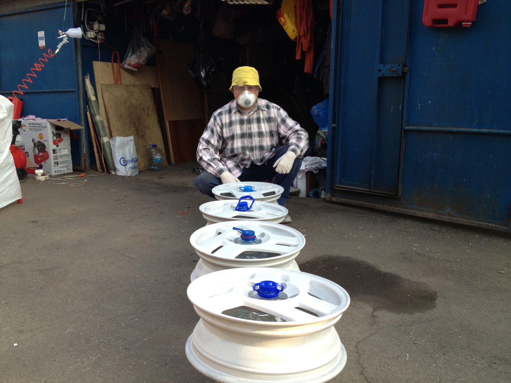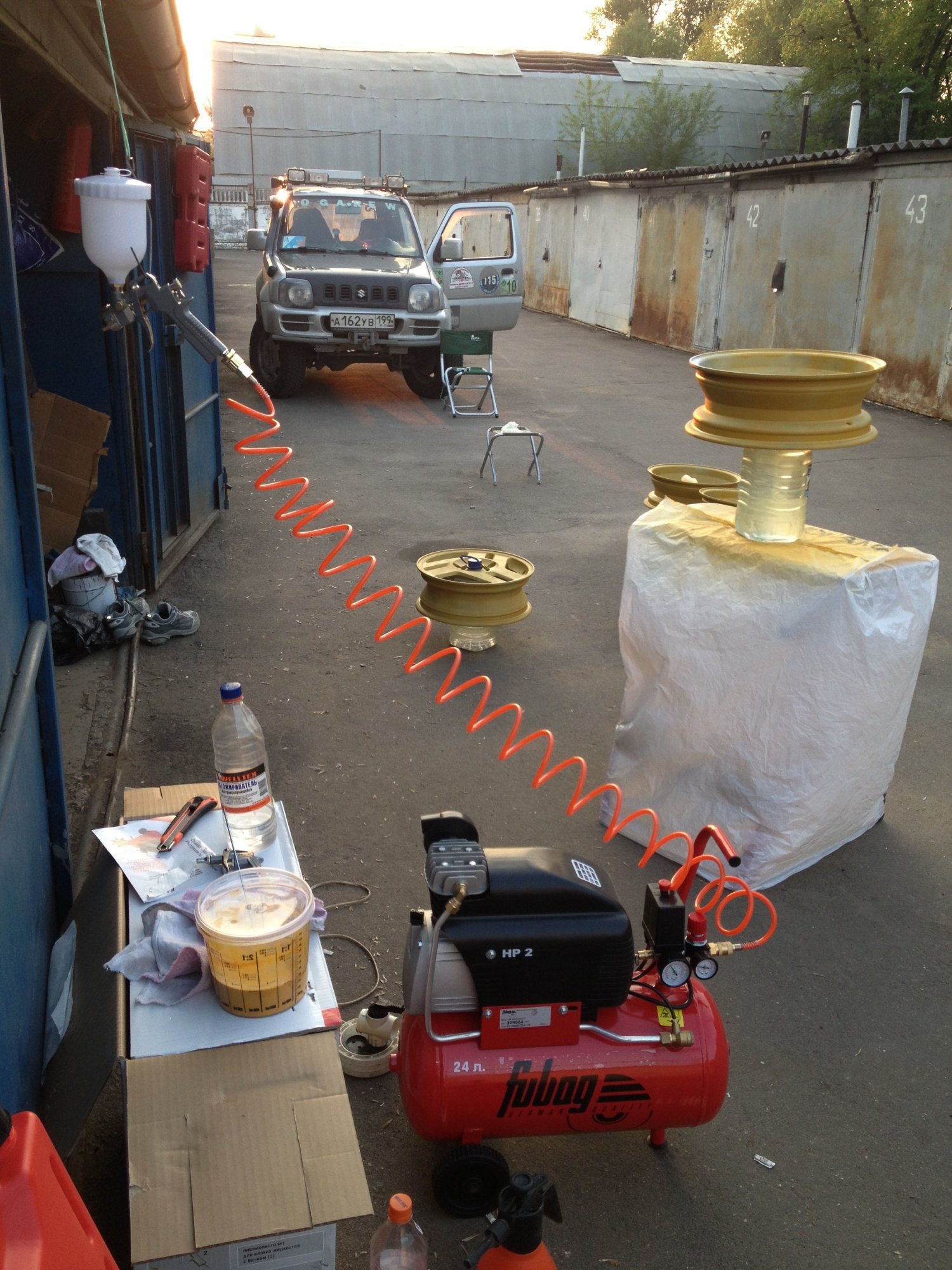 Сейчас,погода и время позволяют,поэтому делается на улице и процесс стал более сложен.Если прошлый раз достаточно было чистки в ручную(муки настоящие),то в этом случае,отдал в пескоструйку(500руб.диск),купил компрессор на 24литра и кучу химии для покраски