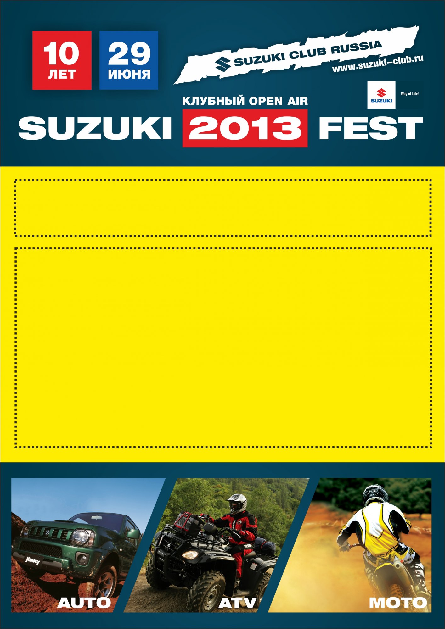Мы приглашаем на наш фестиваль под открытым небом всех сузуководов нашей необъятной! Не важно, ездишь ли ты на мотоцикле, квадроцикле или автомобиле. Важно, чтобы ты ездил на Сузуки! Так что, готовь своего железного любимца и мы ждём тебя 29 июня на подмосковной трассе X-Arena (http://x-arena.ru/).