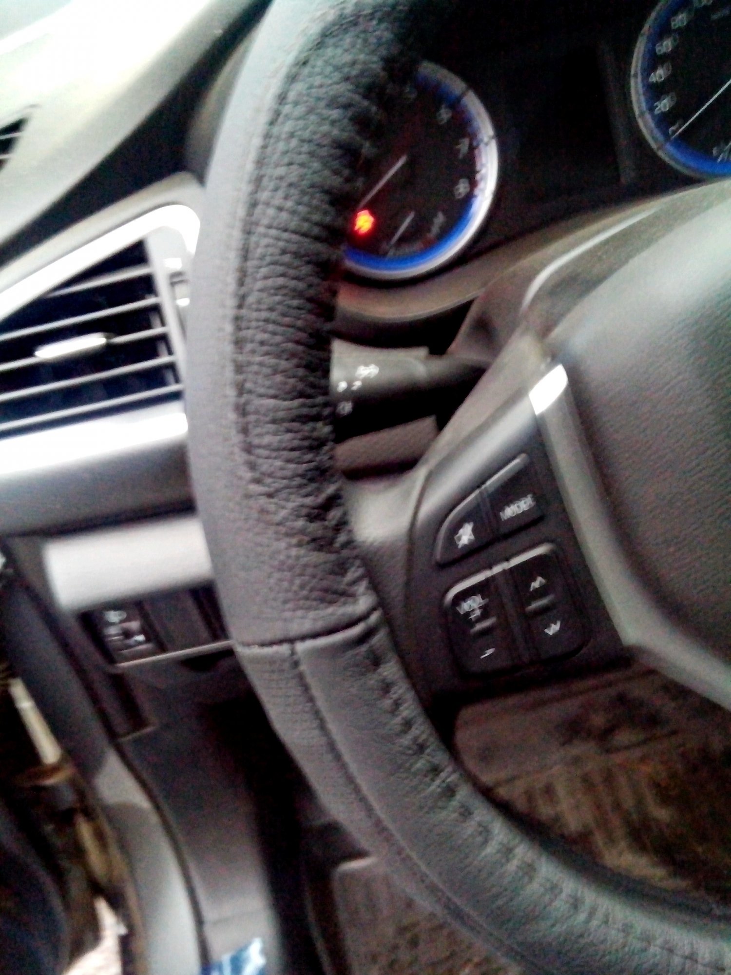 Вчера натянул чехол на руль... Так как подбирал конкретный размер, а у нас руль в диаметре ок. 36 см, поменьше обычных, поэтому чехол пришлось брать соответствующего размера L. Натягивался непросто, с достаточным усилием,