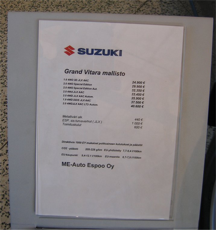 В салоне есть каталоги по Гранд Витаре, очень хоршие и информативные, жаль, только на финском языке... Оказывается, цвета Черный, Азур Грей, Графит Грей и Гров Грин не металлики, а пёрлы. Металлики Силку Силвер, Кашмир Блу, Беж и Бордо. За металлик фины берут еще 400 евро сверху. ЕСП можно дополнительно заказать на любую комплектацию. Цена 1000 евро.