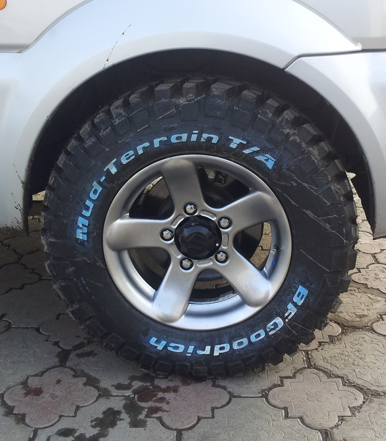 Резину 215/75/R15 BFG MT/AT можно ставить на стандартный джимни с новым бампером (может быть до 2012 года) так как, его обновили, а лже инфу говорить совсем не хочется. Резина влазиет в притык, её можно ставить как временный вариант перед люфтом без серьёзных/средних покатушек в горы. Что я сейчас и сделал. У меня стоит именно такая резина BFG MT 215/75/R15 и Диски Виком 106У. Езжу в универ/домой/универ. Планирую в скором будующем, поставить лифт кит на 35/40мм и испробовать её в горах, без подреза арок. Так как арки резать, совсем не хочется.