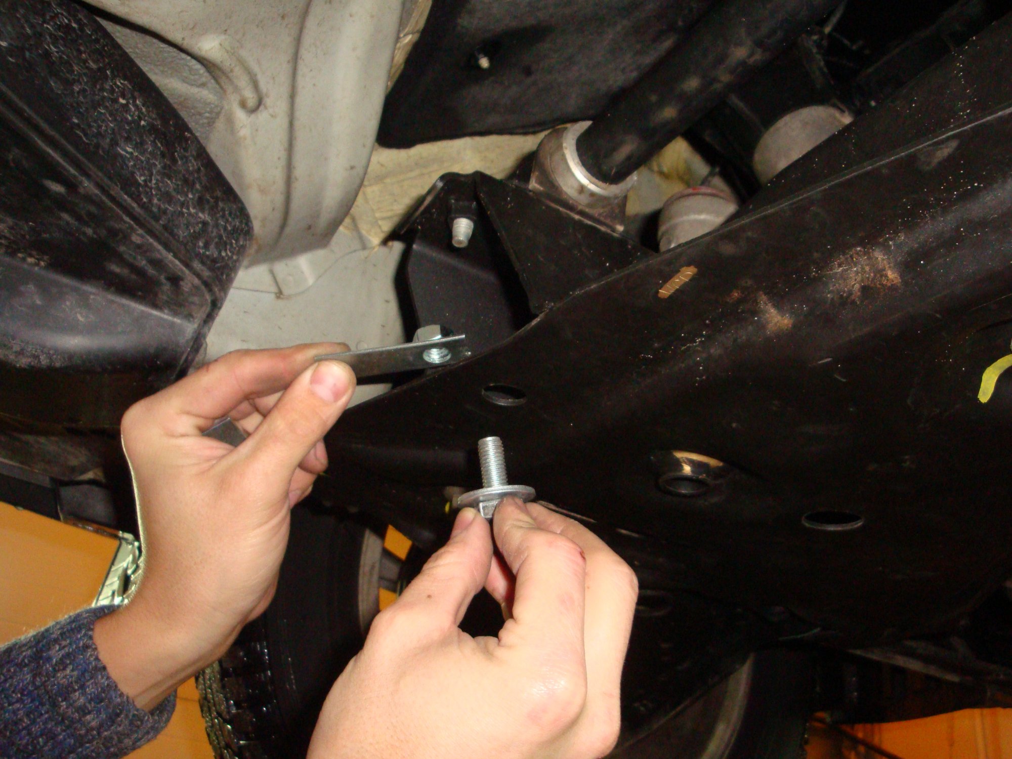 Моя защита заделана хорошим Гравитексом.Переделка кронштейнов-пустяковое дело.Посмотрите мои фото в теме "ремонт о эксплуатация..."Если получится переделать штатные кронштейны, то тогда заодно и перекрашу. А специально не полезу, все равно она внизу (ее не видно) и при ее толщине сгнить не успеет.