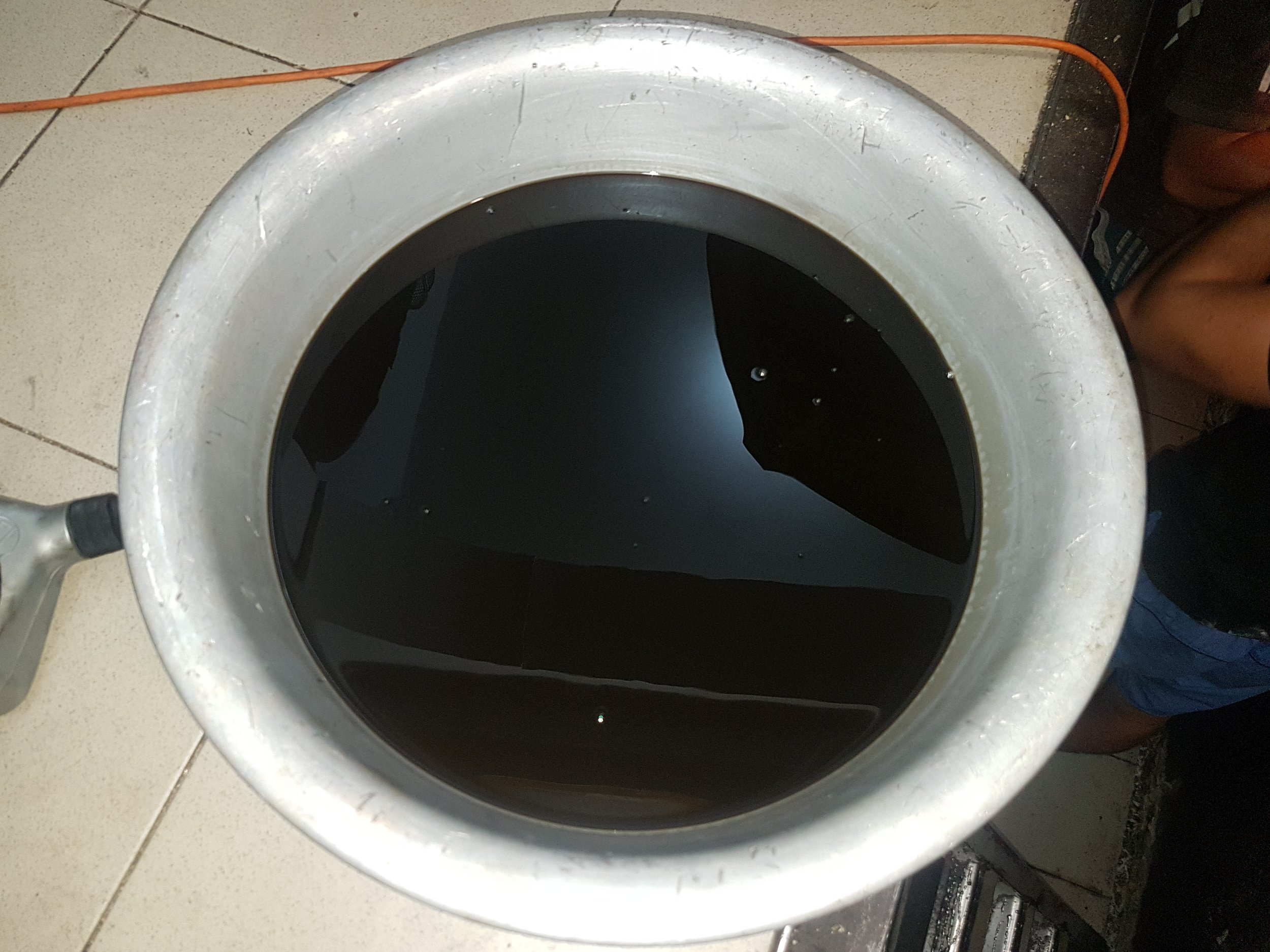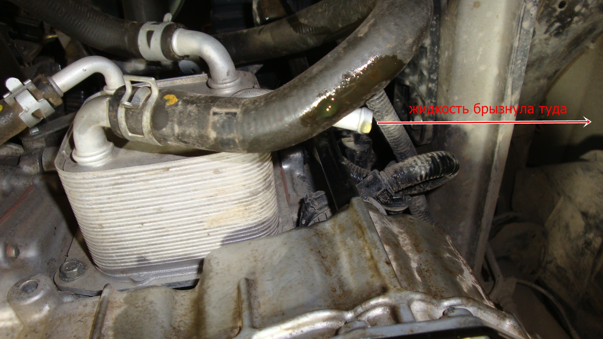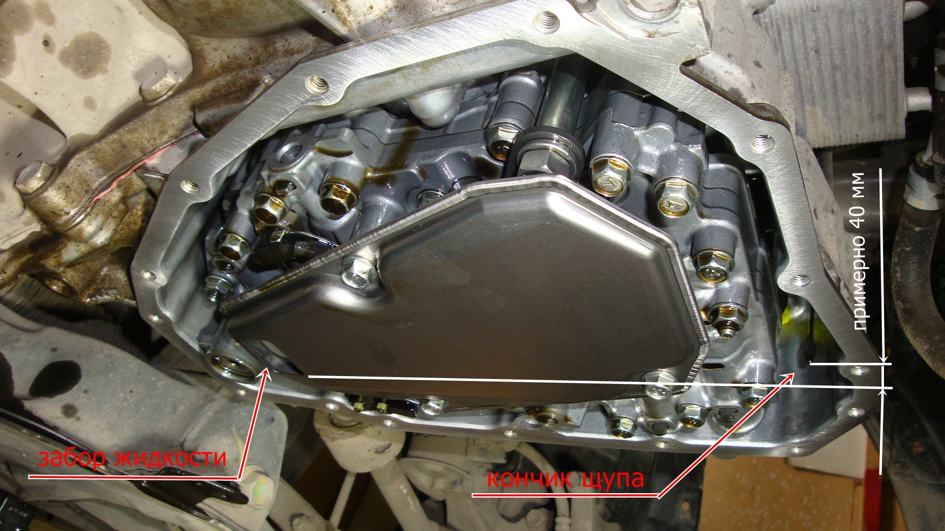и жидкость брызнула на чьи то ботинки,стоявшие возле стены:mosking:.Далее опускаем шланг в 1.5 литровую бутылку.Дальнейшее лучше выполнять с подмастерьем.Заводим двигатель,сливаем примерно литр,глушим.Доливаем (примерно литр).Снова заводим и так несколько раз.Конечно сливаемая жидкость не становиться идеально чистой,но становится прозрачной.Соединяем шланг обратно.Доводим температуру жидкости до необходимой(87 градусов),проверяем уровень жидкости на заведенном двигателе.Случайное фото помогло понять разницу между минимальным уровнем на щупе и нижней точкой забора жидкости(примерно 40 мм.)