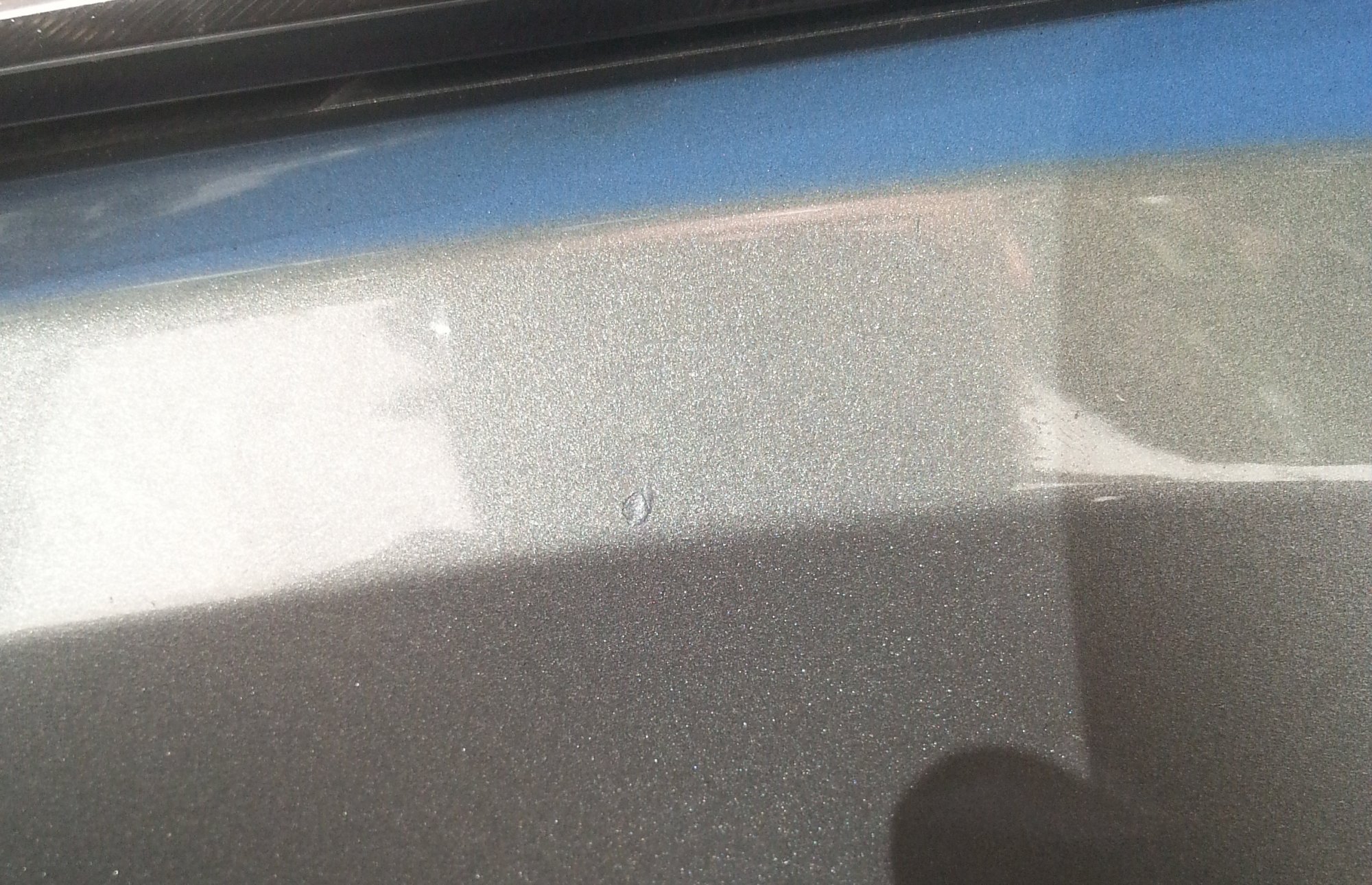 Ударили в середину двери так, что замяли не только полотно, но и ребро жёсткости! Ровнёхонько над пластиковой накладкой, идущей по низу двери. ЛКП в месте удара треснуло и частично скололось (грунтовка, кажется, не повреждена, хотя, как знать...)