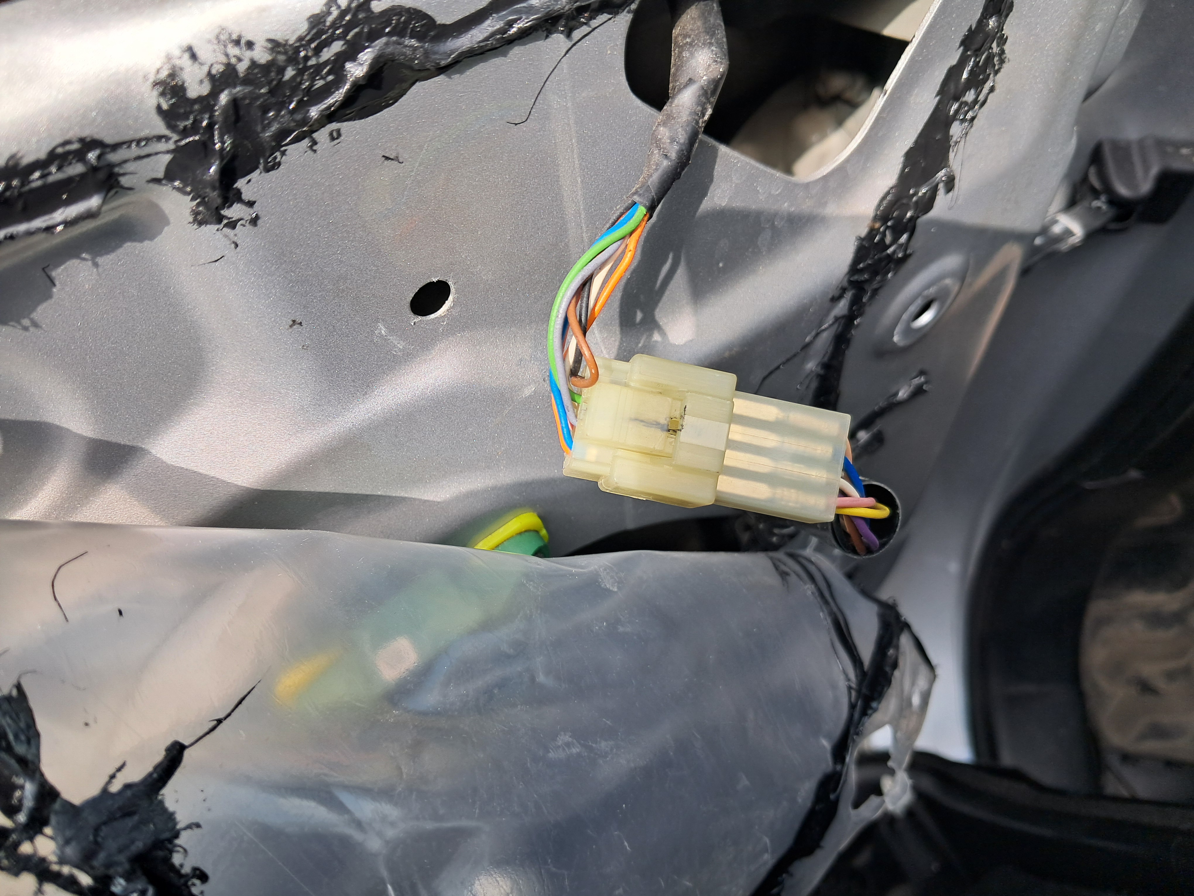 Видим, что разъём с проводами, идущими к зеркалу закреплён на двери. Засовываем руку в отверстие, нащупываем фиксатор типа ласточкин хвост, сжимаем два лепестка, свободной рукой тянем разъём к себе… и вуаля! Он у вас в руках! Так его гораздо удобней рассоединять (на этом этапе придётся повозится, т.к. точка и принцип фиксации в данном разъёме неочевидны