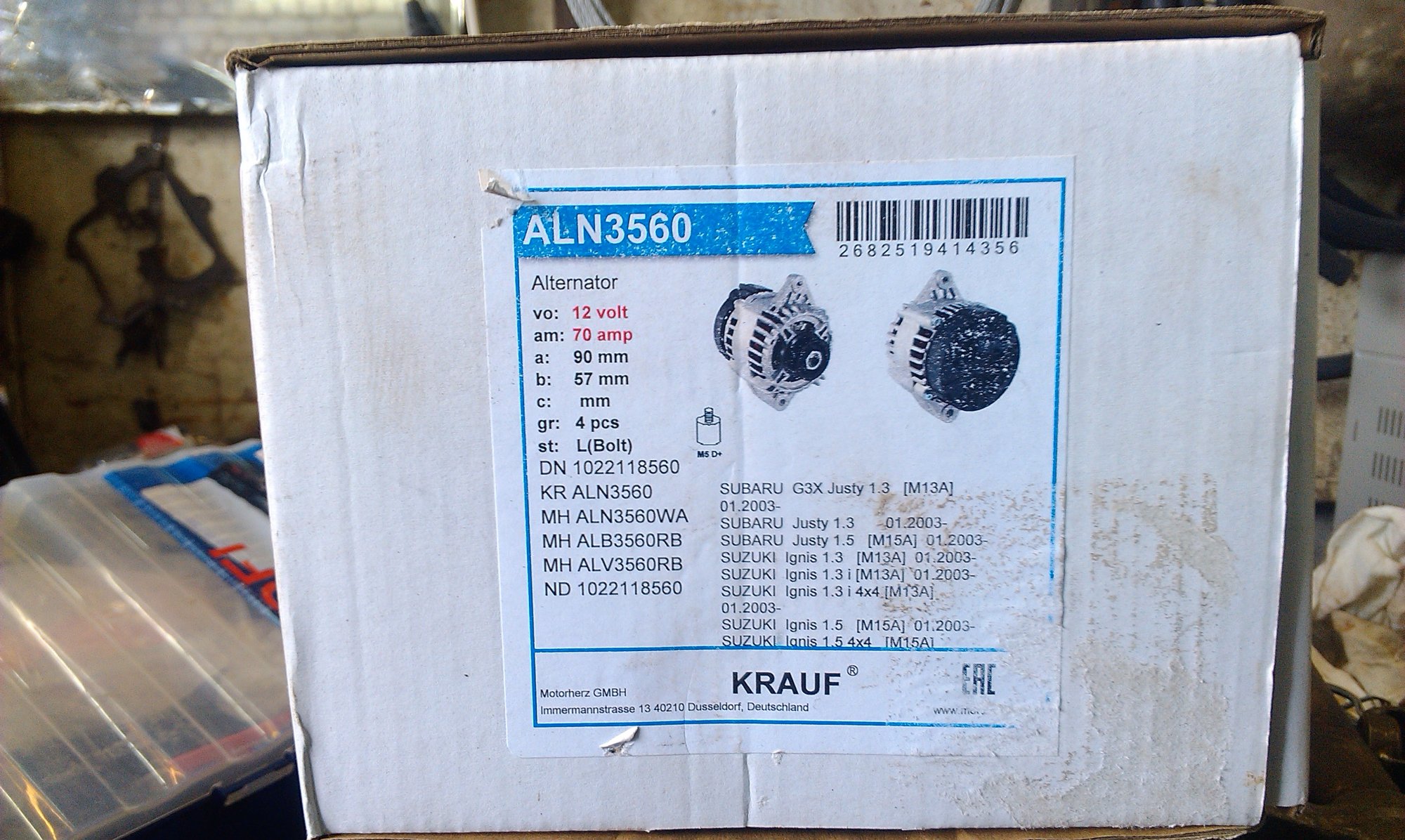 Пред история.При замене масла в ДВС(лью ликви молли), была осмотрена подвеска, и было обнаружено, что у генератора с низу треснут корпус, даже сам не знаю как это получилось, или купил уже такой(но проехал уже около 30000 км и с генератором никогда не было проблем), если не считать иногда свиста в сырую, холодную погоду.Ещё может быть сломали в сервисе, когда снимали стартер, но где стартер и где генератор…Короче, не понятки.Опечалился, но что делать, надо покупать, сначала хотел в экзисте, но он в нашем городе(Иваново), крякнул, пришлось искать в другом месте, "покурил" интернет, хотел на разборке, но у нас не нашёл, а с другого города пока найдут, пока пришлют, да и цена то больно не адекват, от 4500.А потом всё равно старенький надо перебирать и это ещё + — тысячи 3,как минимум.Позвонил в кантору которая занимается ремонтом стартеров -генераторов, цену объявили в 14000(совсем за дураков держат)Опять интернет в помощь-заказал в "автодоке", цена 6890,KRAUF-ALN-3560,заказал 8.05.17 пришло 11.05.17(оперативно).
