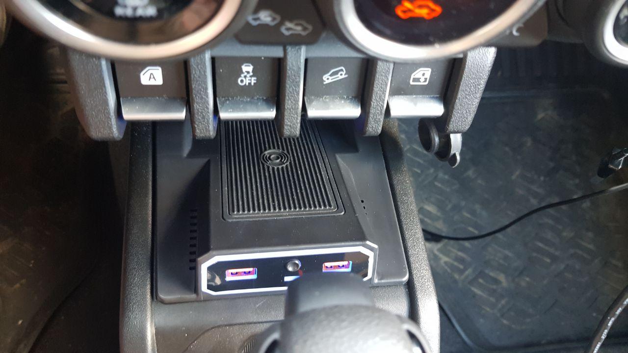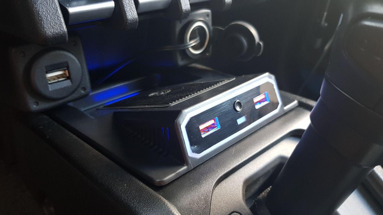 Спроектирована специально под новый джимник. Размещается в нише перед ручкой акпп, запитывается от штатной розетки