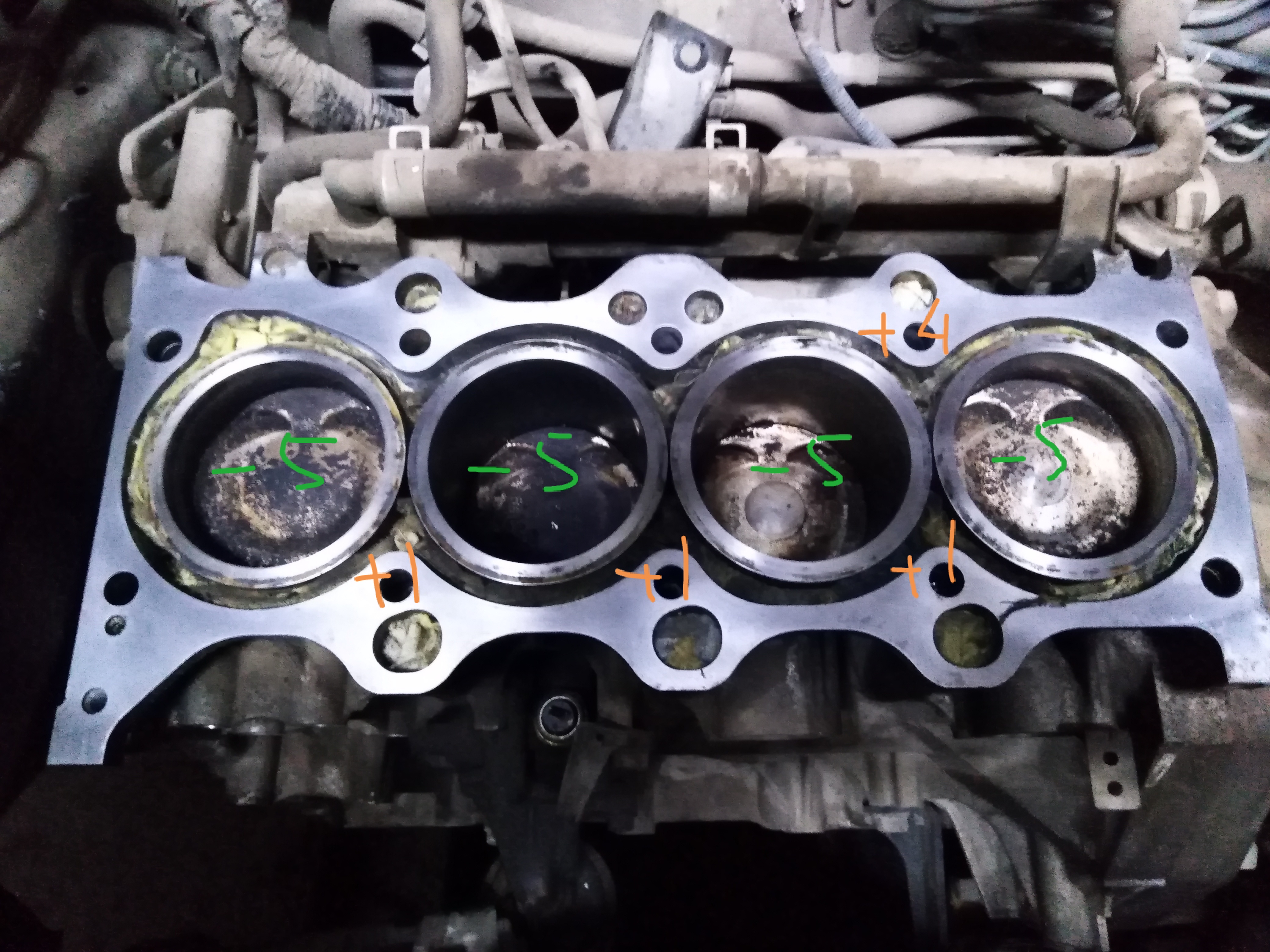Опять потеплело. Езжу по городу - всё вроде бы норм. Вышел на трассу- придавил бачок под горло, а шланги пустые... Ну всё понятно- вот и моя очередь на ремонт... Купил оригинальные кольца и прокладку под голову, Оригинал мс-колпачки. Колечки на воду и маслонасос. Т.е. в планах было сделать лайт-капиталку раз уж буду вскрывать мотор. Масложор был в разумных пределах - около литра на 10ккм. Болты головы не брал !!! Думал оставлю родные по опыту с предыдущей тойотой...