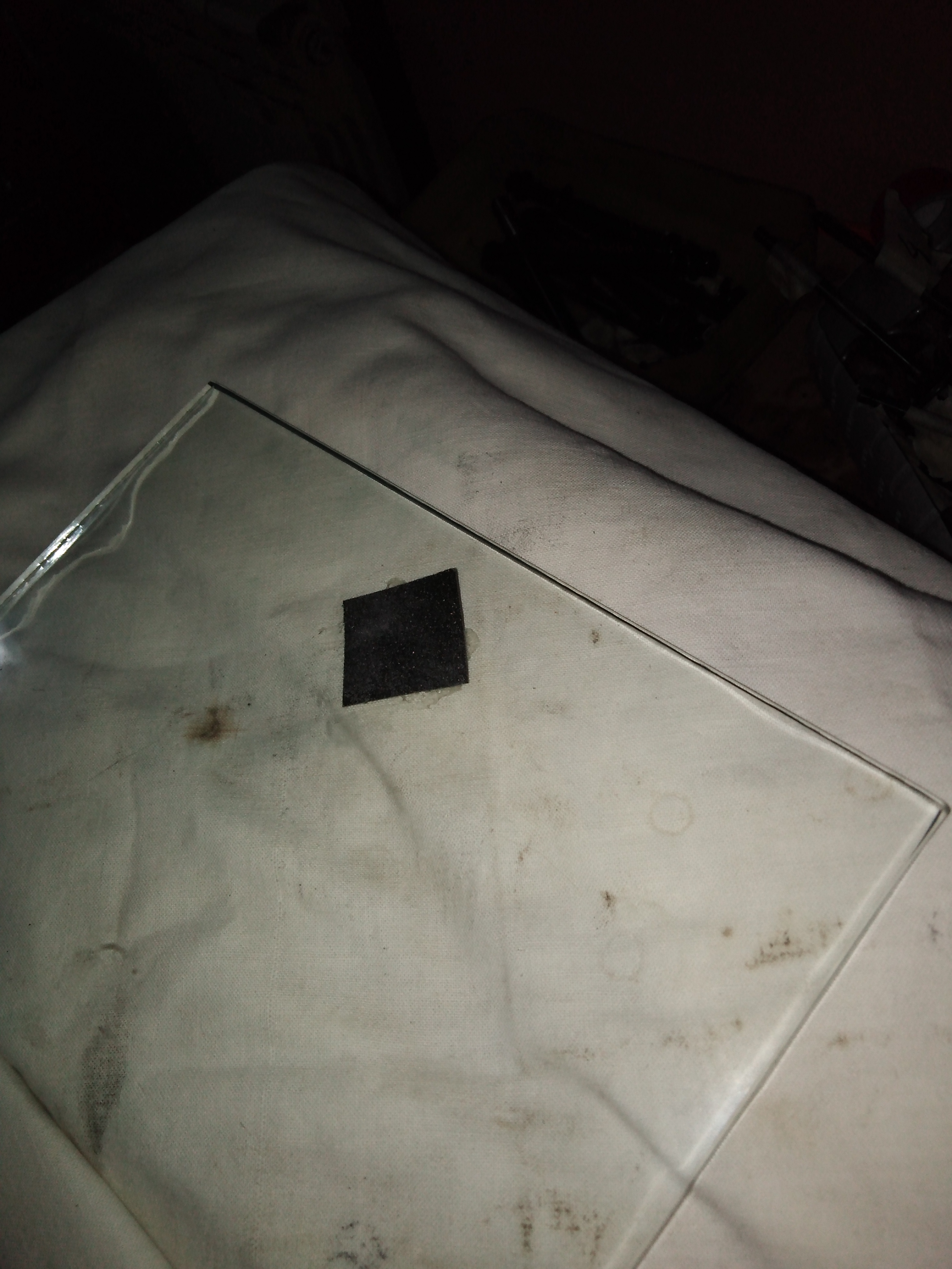 Наша измерительная стеклянная пластина с кусочком наждачки 280 зерна становиться инструментом для шлифовки... В несколько проходов с промежуточным замером Х образными движениями "тупо" спиливаем выступающие участки.